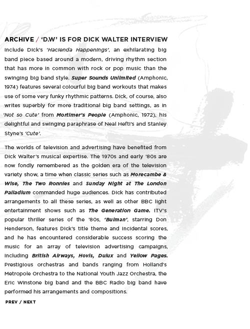 This CD served as my introduction to the talents of saxist-arranger-composer Dick Walter, and a very impressive introduction it proved to be. Each track is a Walter original, and they span a two-decade period, during which modern big band jazz has been at a premium, to say the least. As a jazz composer Dick Walter can stand alongside such worthies as Gerry Mulligan, Bill Russo, Francy Boland, Bob Florence and Bill Holman.