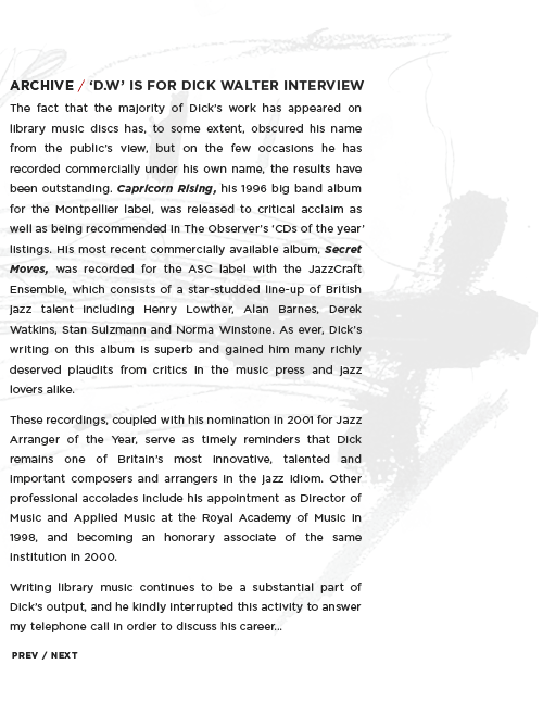 This CD served as my introduction to the talents of saxist-arranger-composer Dick Walter, and a very impressive introduction it proved to be. Each track is a Walter original, and they span a two-decade period, during which modern big band jazz has been at a premium, to say the least. As a jazz composer Dick Walter can stand alongside such worthies as Gerry Mulligan, Bill Russo, Francy Boland, Bob Florence and Bill Holman.